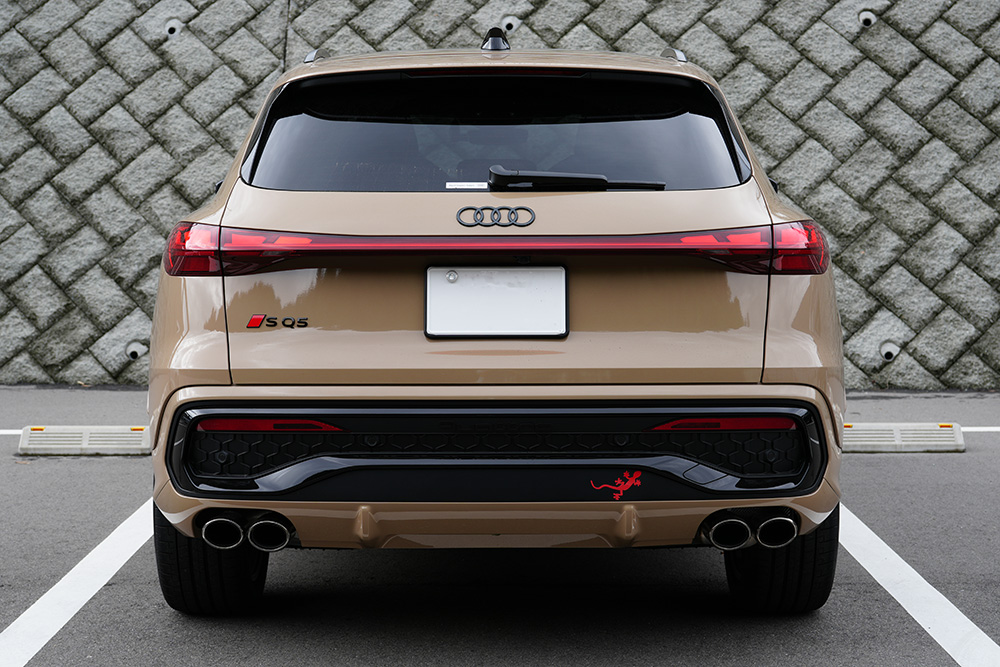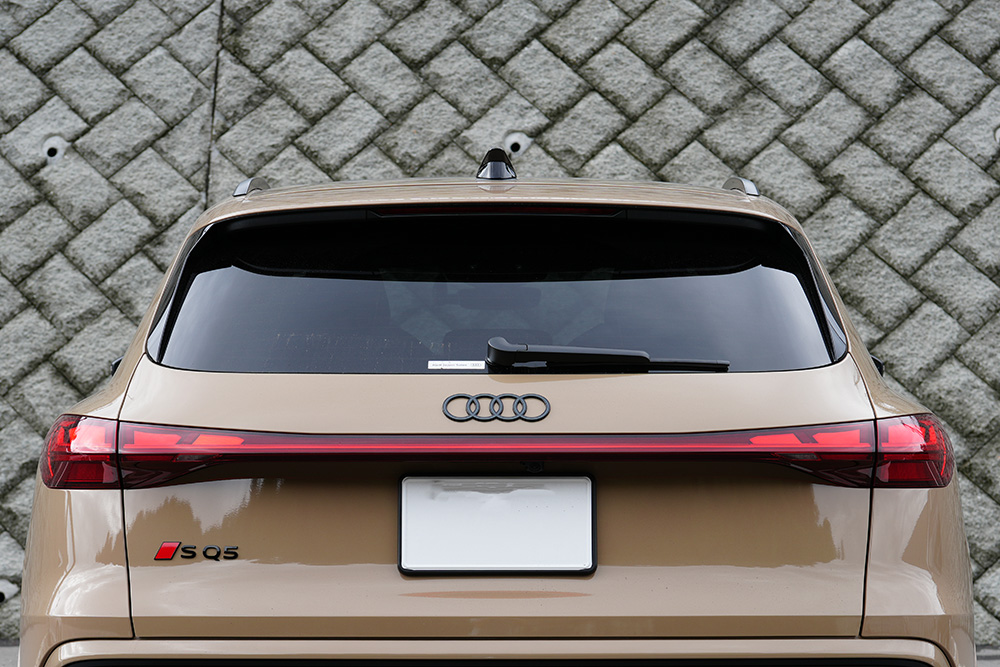 S LineはメルセデスでいうところのAMGパッケージ、BMWだとM Sports、VWだとR lineという位置づけのもので、つまりパフォーマンスモデルに準拠したスポーティなパッケージオプションが付いてますよ、という証明書みたいなものなのですが、S lineが標準のSQ5には当然ながらこのバッジも付いていません。