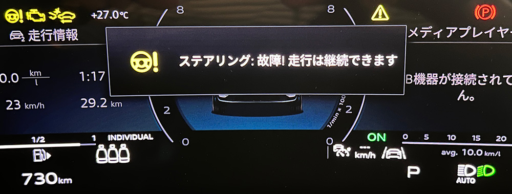出たエラーインジケーターがイエローということもあって走行不能ではなかったのですが、念のためにトロトロと徐行しながら駐車場にたどり着きました。