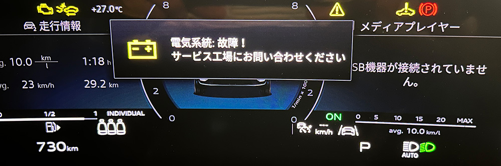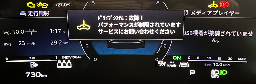 駐車場にたどり着いた後、エンジンをオフにして再度オンにしてみましたが変わらず。