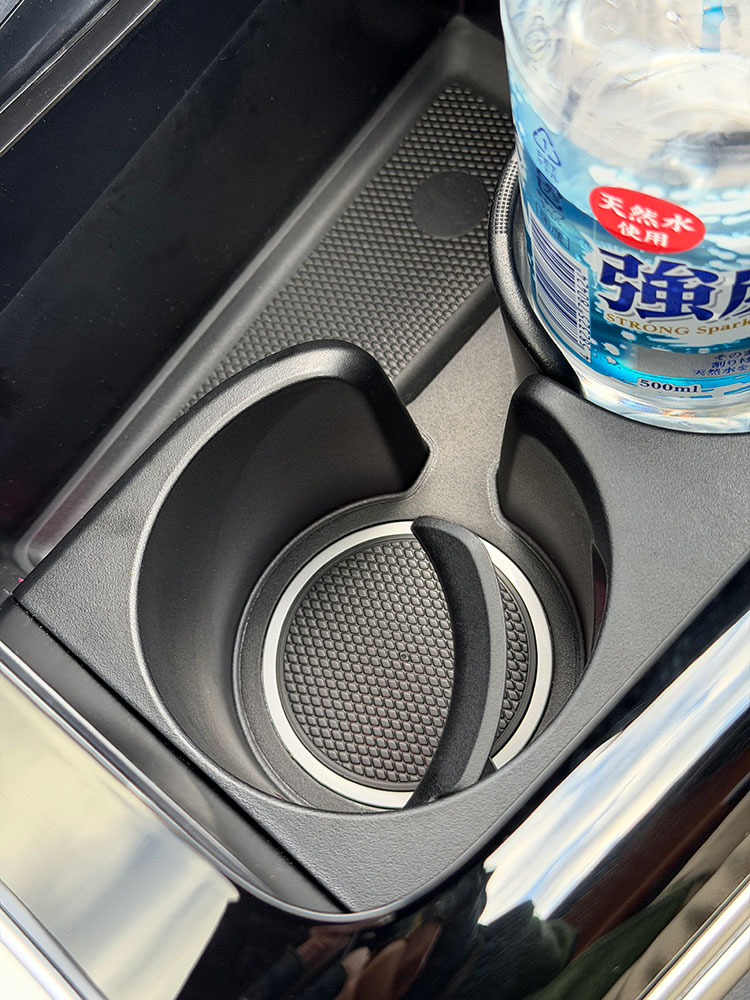 ちなみに前席に2つあるドリンクホルダーのうち手前(後ろ側というべきか)は説明したホールドロジックなのですが、前方にあるもう一つの方はまた違うロジックでして、こちらは通常?ではドリンクホルダーとしては機能していません。半分くらい囲われている感じであとはフリー。