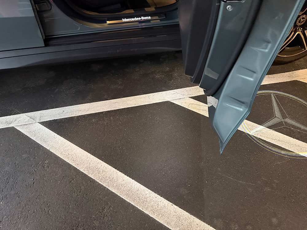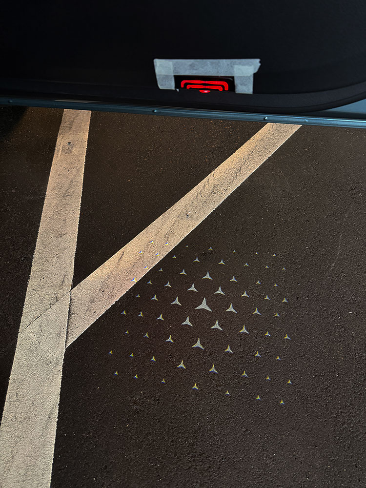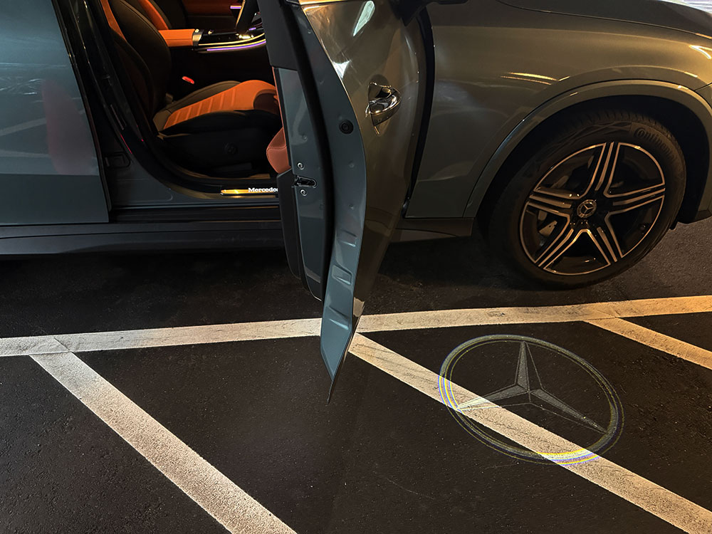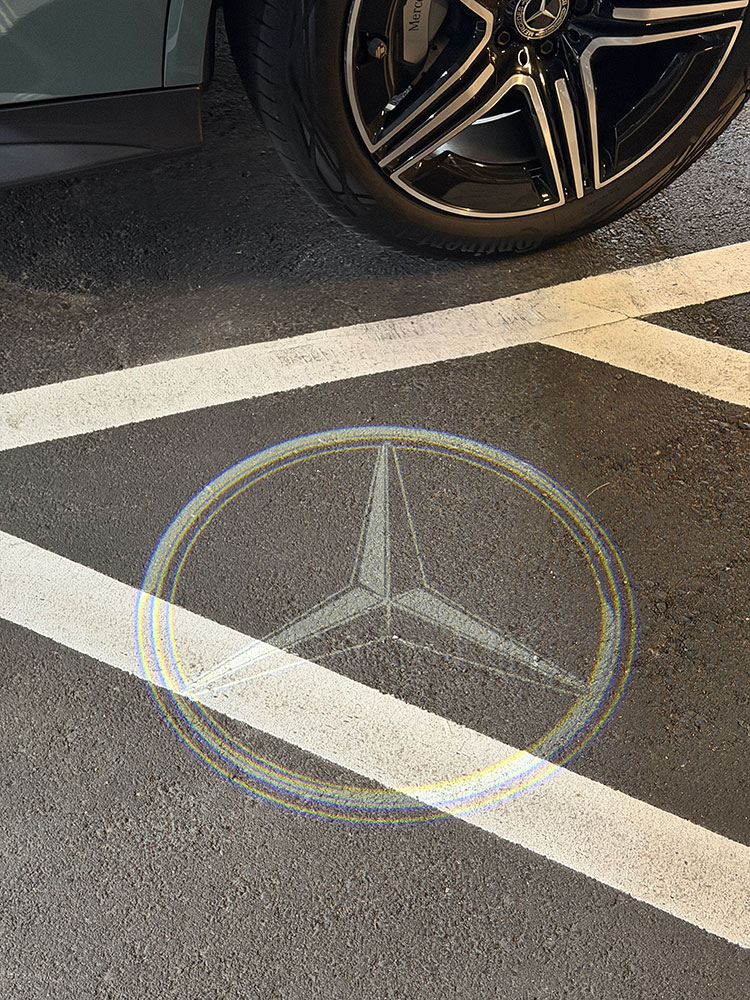 というのも純正装着されているスリーポインティッドスターロゴのプロジェクションはドア下のカーテシーランプではなく、ミラー下部から投影されているもので、実際の乗降時にサイドシルの下側あたりを照らす部分はただの白光でございました。
