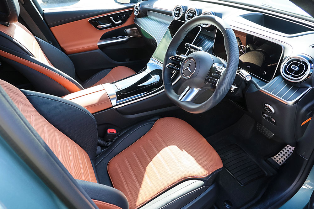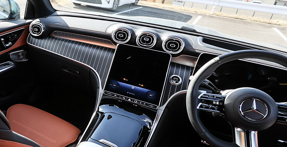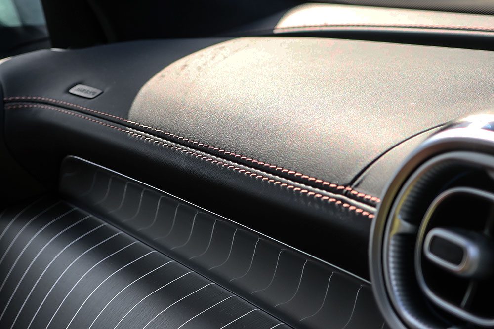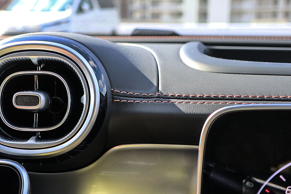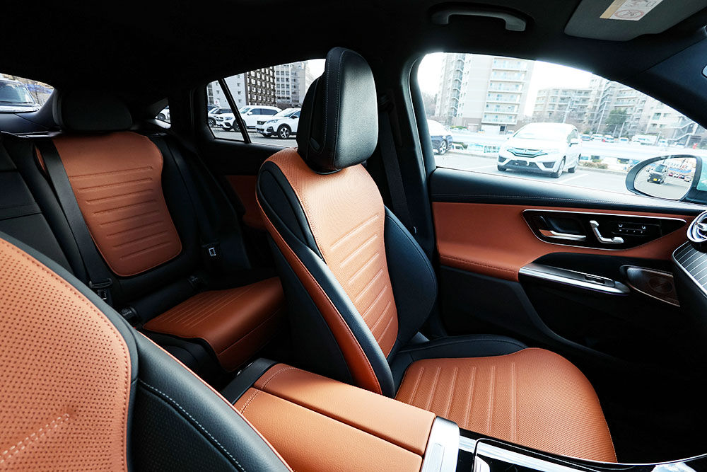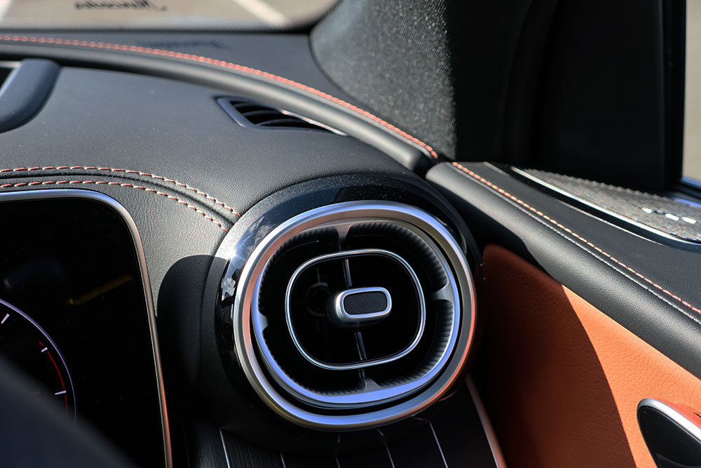 具体的にはメルセデス的にはシエナ・ブラウンと呼ぶオレンジがかったブラウン系の色が黒いレザーのフチを彩っています。